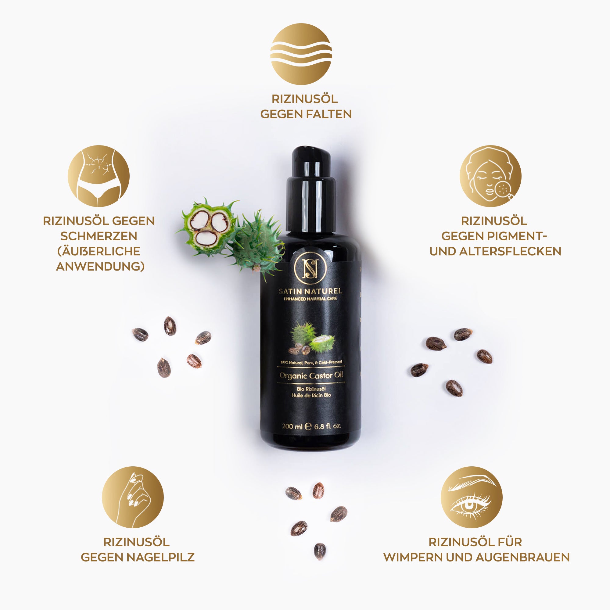 Das natürliche Öl dringt tief in die Haarstruktur ein, überzieht jedes einzelne Haar mit einem Schutzfilm und schenkt ihm viel Feuchtigkeit. Außerdem regt es den Haarwuchs an. Rizinusöl ist ein bewährtes Hausmittel, Wimpern und Augenbrauen weich und geschmeidig zu machen, es kräftigt sie und lässt sie seidig glänzen.