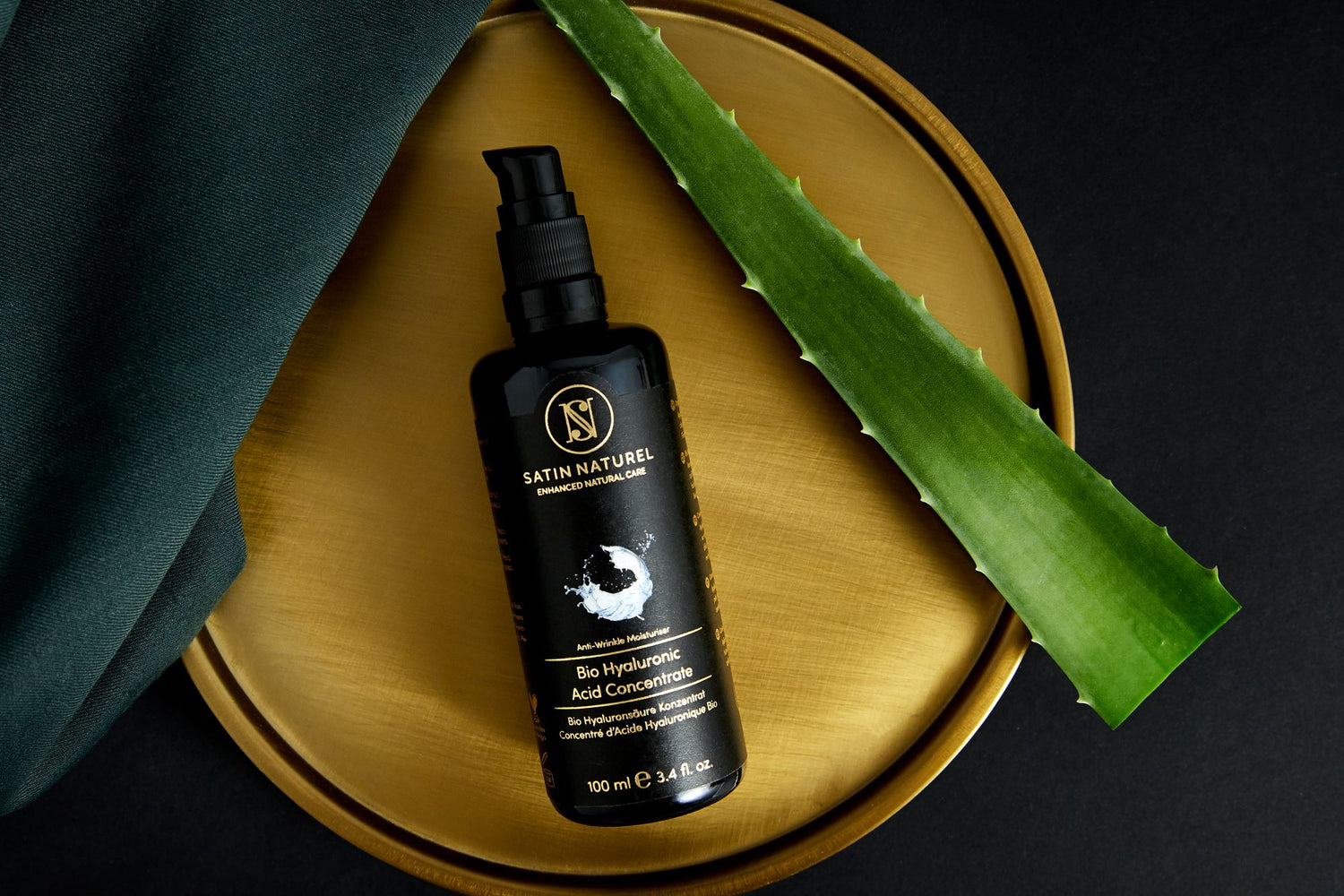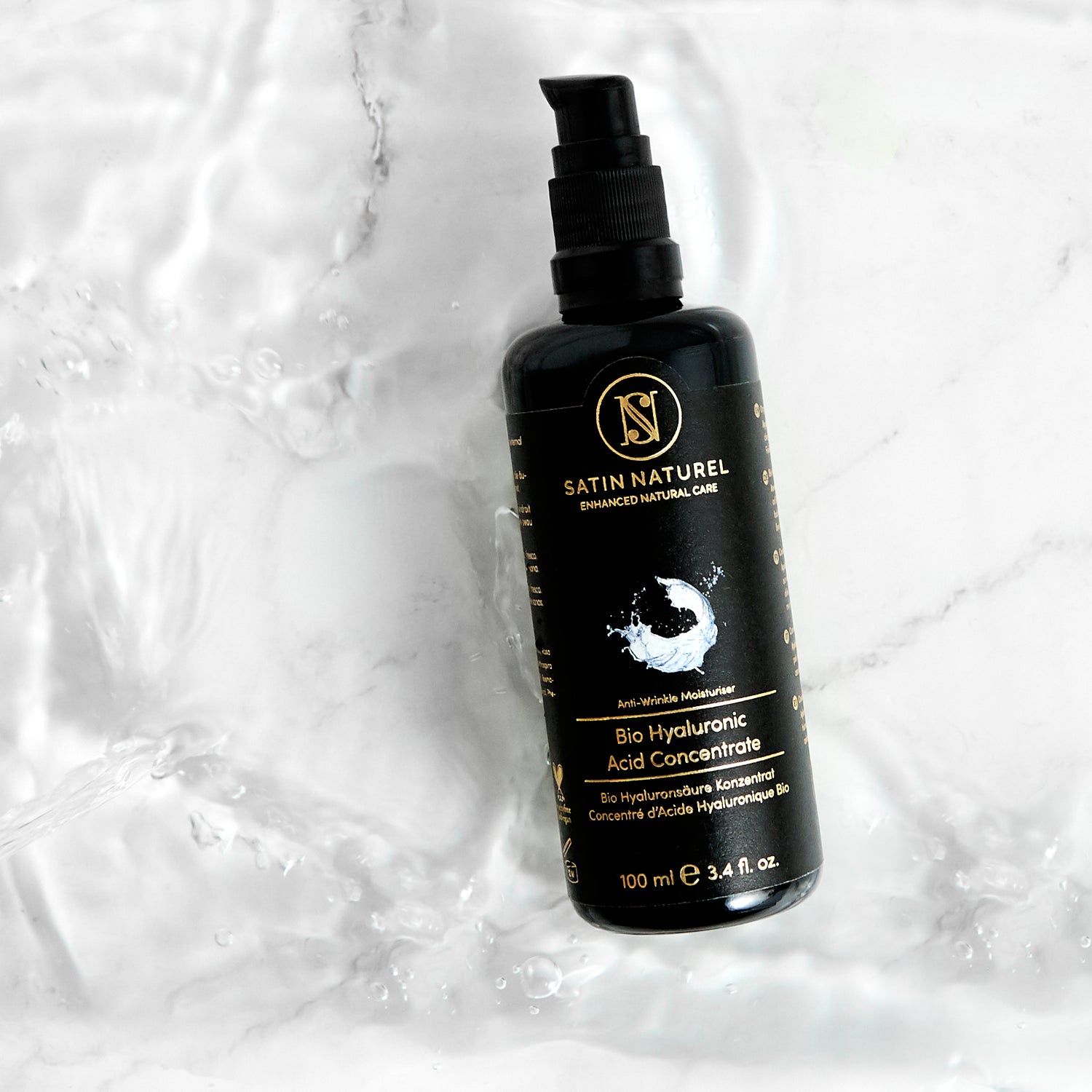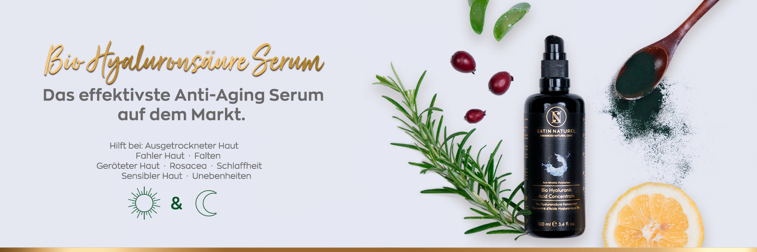 Das Bio Hyaluron Konzentrat von Satin Naturel ist Deutschlands erstes Bio Hyaluronsäure Serum. Das Hyaluronsäure Konzentrat überzeugt durch seine multimolekulare Hyaluron Säure. Dadurch bietet Dir das Hyaluron Konzentrat einen vierfachen Anti-Falten Effekt. Das Hyaluron Konzentrat wirkt auf der Oberfläche, aber auch bis in die Tiefen Deiner Haut. Es polstert bereits bei der ersten Anwendung Deine Falten auf und spendet Deiner Haut reichlich Feuchtigkeit. Erste Ergebnisse sind bereits nach der ersten Anwendung sichtbar. Dein Hautbild wirkt sofort geglättet und die Entstehung von Falten wird durch die Anwendung des Hyaluronsäure Konzentrat Gels langfristig herausgezögert. Weitere Inhaltsstoffe, die sich positiv auf Dein Hautbild auswirken, sind Bio Aloe Vera, Rosenblütenöl und Spirulina Algen. Das Hyaluron Konzentrat enthält alles, was Du für eine optimale Anti-Aging-Pflege benötigst.