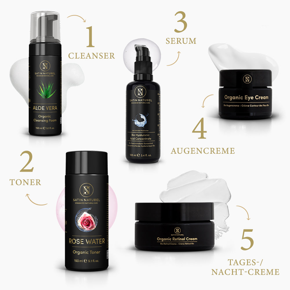 Mit dem Serum gönnst Du Deiner Haut besonders effektive Wirkstoffe in hochkonzentrierter Form. Bedingt durch die leichte Konsistenz, zieht das Serum besonders tief in die Haut ein. Deswegen solltest Du innerhalb Deiner Pflegeroutine grundsätzlich Produkte mit leichter Textur (Wasser- oder Aloe Vera Basis) vor reichhaltigeren Produkten wie z.B. einer Creme (Öl-Basis) verwenden. Je nachdem, worauf Du innerhalb Deiner Pflegeroutine den Schwerpunkt legen möchtest, bietet Satin Naturel Dir eine Vielzahl von Optionen: