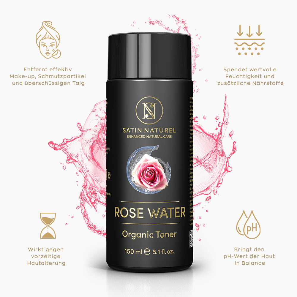 Der Satin Naturel Rose Water Organic Toner zeigt sich in Deiner Pflegeroutine als wahres Multitalent, wenn er Deine Haut mit seiner feuchtigkeits- und nährstoffspendenden Aloe Vera Basis optimal beruhigt und pflegt, während er gleichzeitig für tiefgehende Reinigung sorgt und den pH-Wert Deiner Haut in Balance bringt. Doch es geht noch weiter: Zusätzlich polstert die im Rose Water Organic Toner enthaltene Hyaluronsäure Deine Haut von innen auf und sorgt für ein pralles und vitales Hautgefühl.