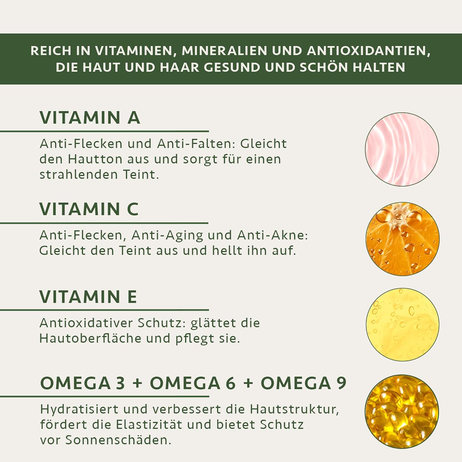 Der hohe Anteil an Vitamin A & C sorgt für einen reinen, ebenmäßigen Teint und lässt Unreinheiten, Pigmentflecken, Pickelmale und Rötungen verblassen.
