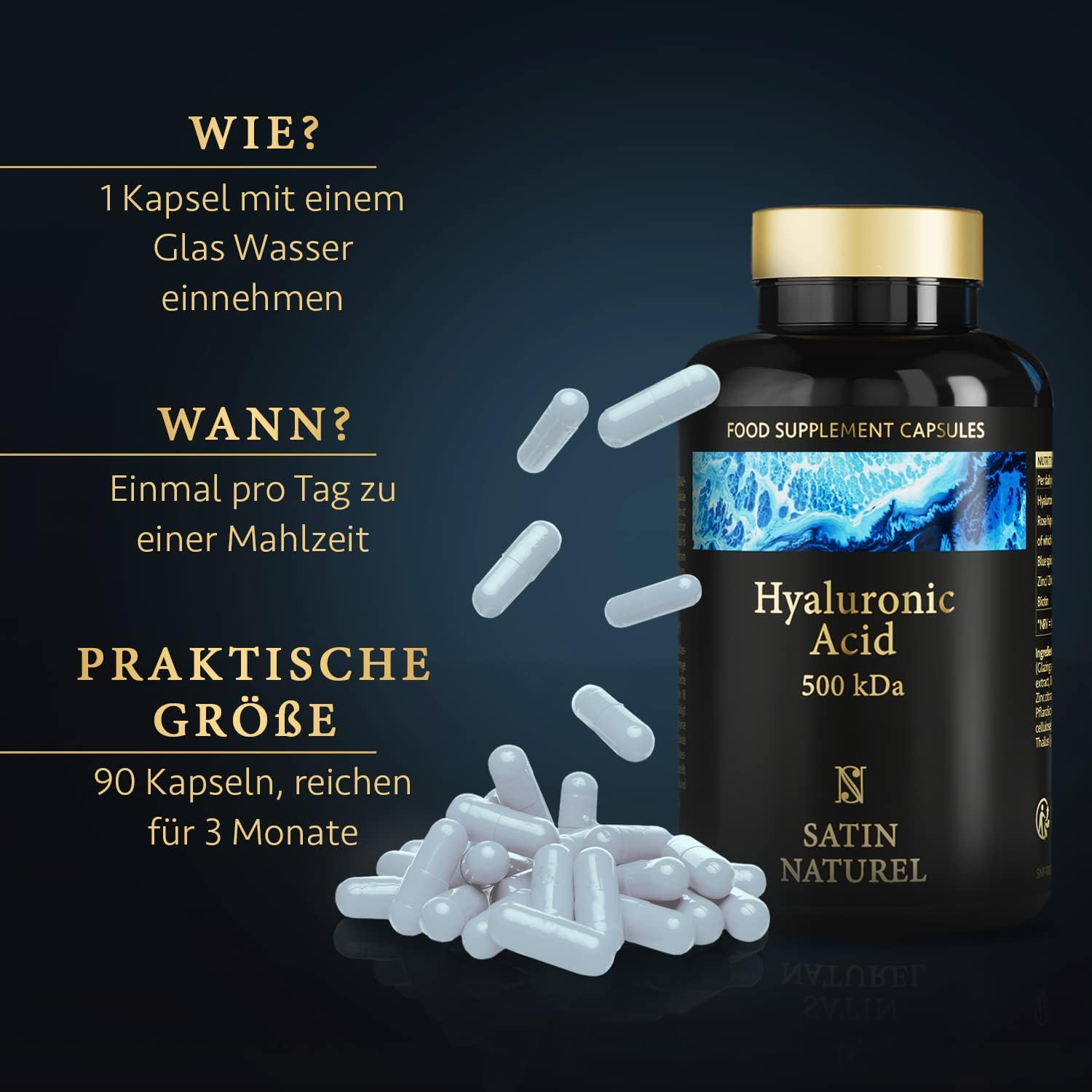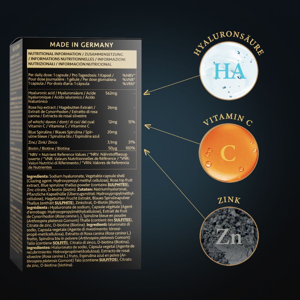 Auch wenn die Zeiten stressig und hektisch sind, sind die Hyaluronsäure Collagen Kapseln Deine Anti-Stress Lösung. Mit ihnen gibst Du Deinem Körper wichtige Nährstoffe, wenn der Alltag in den Weg kommt und keine Zeit für ausgewogene Ernährung lässt. Die Haut Haare Nägel Kapseln tragen auch zur Anti-Falten Care bei und helfen gegen raue Haut und pflegen das Gesicht und Deine Haut generell.